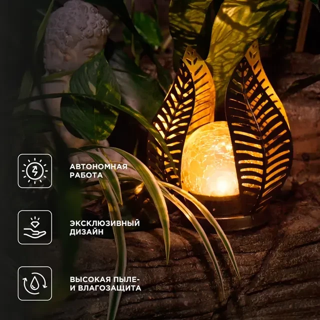 Светильник Шанти – это изысканный элемент садового декора, предназначенный для создания дополнительного освещения или акцентной подсветки. Изделие можно установить на террасе, веранде, под деревом, возле пруда или среди других растений. Дизайн светильника вдохновлен природной красотой острова Бали и сочетает в себе натуральность и экзотичность тропического стиля. В центре светильника нежно светится луна, окруженная листьями папоротника. Такая форма с мягкими изгибами и контурами создает атмосферу гармонии и спокойствия. Светильник оснащен солнечной панелью, которая поглощает солнечные лучи в течение дня и преобразует их в электрическую энергию. Накопленная энергия хранится во встроенном аккумуляторе, что позволяет светильнику автономно функционировать около 6-8 часов и освещать окружающую территорию вечером и ночью, не требуя подключения к электросети.