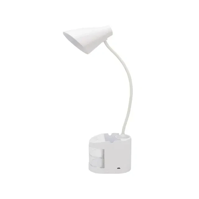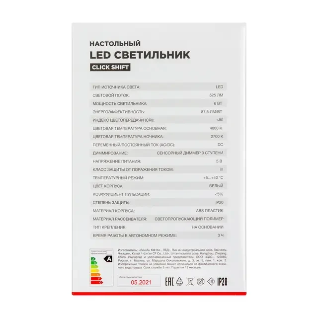 Настольный светильник REXANT Click Shift используется для освещения рабочего места. Современный дизайн придаст изысканность любому интерьеру, а высокое качество светодиодного источника света без пульсаций, позволяют использовать светильник как в офисе, так и дома. Функциональный ночник с мягким светом позволяет использовать светильник в качестве деликатной мягкой подсветки. Матовый рассеиватель обладает антиослепляющим эффектом и уменьшает габаритную яркость, создавая равномерный и мягкий свет. Стильный и вместительный органайзер позволяет размещать письменные и подручные принадлежности. Светильник оснащен аккумулятором, благодаря которому может работать до 3 часов при отсутствии питания от сети. Заряжается от источника питания 5 В постоянного тока через универсальный порт USB (USB-кабель входит в комплект). Технические характеристики: Тип источника света: LED Световой поток: 525 Лм Мощность светильника: 6 Вт Энергоэффективность: 87.5 Лм/Вт Индекс цветопередачи (CRI): >80 Коррелированная цветовая температура основного света (в сфере): 4000 К Коррелированная цветовая температура ночника: 2700 К Переменный/постоянный ток (AC/DC): DC Диммирование: встроенный сенсорный диммер 3 ступени Напряжение питания: 5 В Класс защиты от поражения током: III Габаритные размеры: 420х120х80 мм Электромагнитная совместимость: ТР ТС 020/2011 Климатическое исполнение: УХЛ4 Температурный режим: +5...+40 °С Цвет корпуса: белый Коэффициент пульсации: <5% Степень защиты: IP20 Класс энергоэффективности: A Встроенный аккумулятор: время работы без питания от сети 3 часа КСС Д Гарантия: 1 год Материал корпуса: ABS-пластик Материал рассеивателя: светопропускающий полимер Тип крепления: на основании