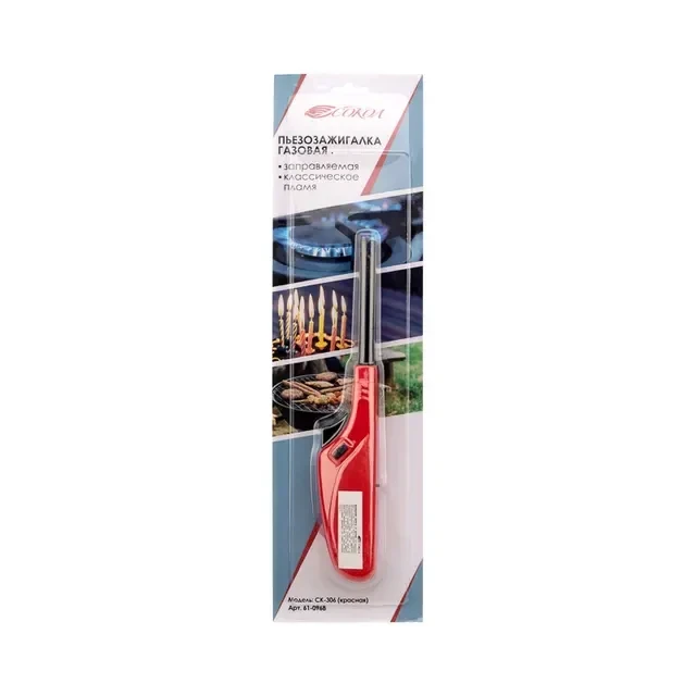 Бытовая пьезозажигалка с классическим пламенем, c держателем. Общие габариты зажигалки: 205х38х25 мм Тип поджига: пьезоэлектрический Цвет: красный