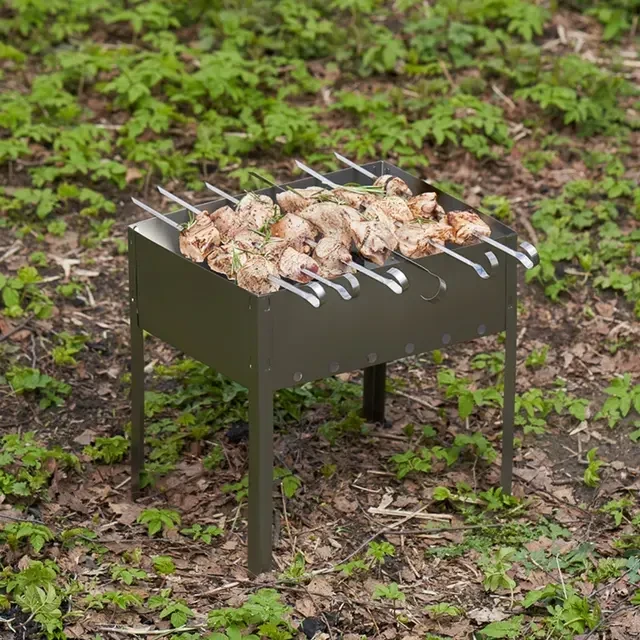 Походный компактный разборный мангал СОКОЛ изготовлен из стали, не подвергается тепловым деформациям от углей и дров. Предназначен для многоразового использования. Сборка и установка мангала производится вручную без использования специальных инструментов. На стенках жаровни предусмотрены специальные отверстия для интенсивного горения. Общая высота ножек 350 мм оптимальна и удобна для приготовления шашлыков. Размеры жаровни 350х250 мм позволяют разместить шампуры и получить порцию блюда, рассчитанную на небольшую компанию. Толщина стенки – 0,4 мм. В разобранном виде мангал не занимает много места и легко помещается в багажник автомобиля. В комплекте предусмотрены 6 угловых шампуров размером 370х10х0,6 мм. Изделия поставляются в термопленке. Размеры мангала (ДхШхВ): 350х250х350 мм.