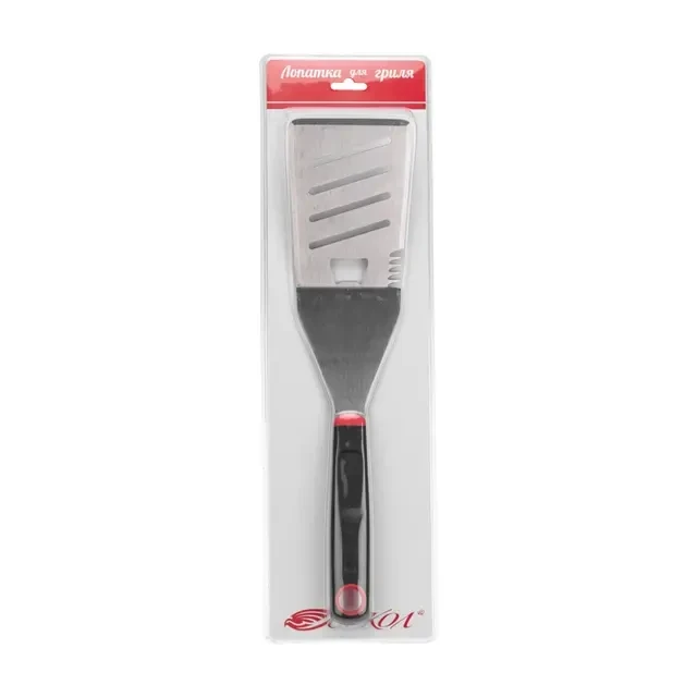 Лопатка для гриля СОКОЛ длиной 38 см имеет широкий функционал. Позволяет переворачивать еду, открывать бутылки, а с помощью зубчиков на одной из сторон – отбивать стейк. Основание шириной 9 см выполнено из прочной нержавеющей стали, не подвергающейся коррозии и существенным изменениям рабочих свойств при длительной эксплуатации. Прибор можно мыть в посудомоечной машине. Длинная рукоятка из термостойкого пластика позволяет перемещать и переворачивать продукты на решетке на безопасном расстоянии от жара, предотвращая ожоги и травмы. Рабочая часть лопатки с отверстиями выполняет функцию шумовки – через отверстия происходит отток лишней жидкости (бульона, соуса или масла).
