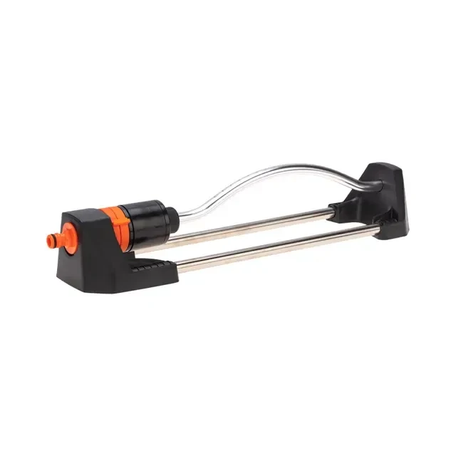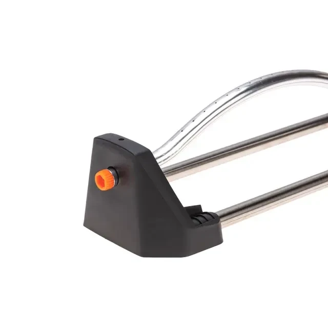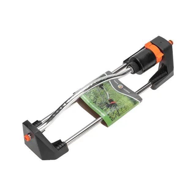 Осциллирующий дождеватель предназначен для полива растений и почвы. Представляет собой дугообразную трубку с расположенными на ней отверстиями, закрепленную на неподвижной подставке. Под напором воды трубка качается из стороны в сторону и обеспечивает равномерный полив участка. Пользователь может изменять дальность полива посредством регулирования угла качания. Надежное и герметичное крепление шланга к дождевателю осуществляется при помощи универсального соединителя, расположенного на корпусе устройства. Подставка дождевателя изготовлена из качественного и прочного пластика, устойчивого к воздействию низких температур и ультрафиолета. Кол-во отверстий для полива – 17. Минимальное давление – 2 бара. Площадь орошения – 190 м2. Максимальная дальность действия – 8 м. Используемые материалы: ABS-пластик, полипропилен, алюминий, основание из нержавеющей стали.