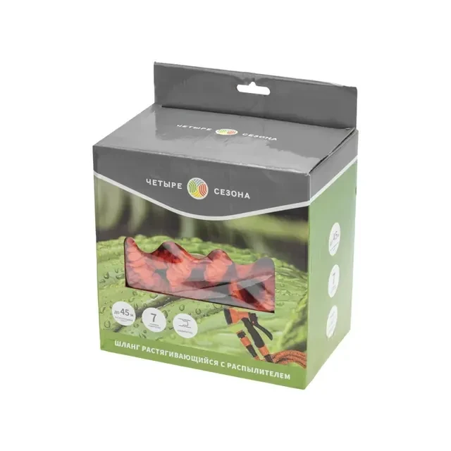 Поливочный набор применяется при организации систем полива и систем водоснабжения. Включает в себя растягивающийся шланг, пистолет-распылитель, а также 2 коннектора для соединения. Поливочный шланг устойчив к износу и воздействию внешних факторов, не образует перегибов. Размер шланга в сложенном виде 15 метров. При подаче воды он растягивается до 45 метров. При хранении не занимает много места. Пистолет-распылитель оснащен эргономичной ручкой, благодаря которой изделие удобно и комфортно держать в руке. Имеет 7 режимов подачи воды, регулируемых поворотной головкой. Также на пистолете предусмотрен фиксатор, позволяющий зафиксировать курок и не зажимать его пальцами в процессе полива. Набор комплектуется соединителем для быстрого и удобного подключения шланга к поливочной системе.