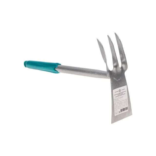 Мотыжка используется при выполнении работ в садах, огородах, цветниках и т.д. Применяется для рыхления почвы, формирования рядов для посева, прополки сорняков и многого другого. Рабочая часть и рукоятка выполнены из метала с порошковым покрытием, благодаря чему грабли обладают долговечностью, прочностью и надежностью. Конструктивно рабочая часть состоит из лопатки и 3 витых зубцов. Cверху рукоятка покрыта пластиком, что препятствует скольжению инструмента в руке и создает комфорт при выполнении работ. Также в рукоятке предусмотрено отверстие, позволяющее размещать мотыжку на вертикальных поверхностях, что обеспечивает удобство хранения и позволяет экономить место на рабочем пространстве.