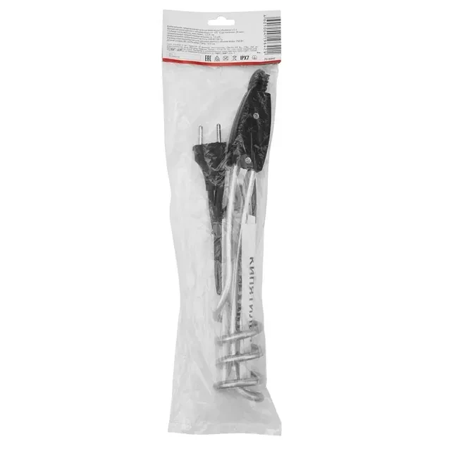 Электрический кипятильник REXANT мощностью 1500 Вт с нержавеющим нагревательным элементом разработан для нагрева и кипячения воды. Компактные размеры изделия занимают мало места, благодаря чему кипятильник удобно брать с собой в путешествия. Также он может пригодиться в домашних условиях, когда невозможно нагреть воду при помощи газовой плиты. Прибор состоит из нагревательного элемента (ТЭНа), термостойкой рукоятки, шнура питания с евровилкой и специального крючка для комфортной установки устройства в емкость с водой. Кипятильник предназначен для нагрева воды объемом 5,5 л. Технические характеристики: Время нагрева 5,5 л воды до кипения: 26 мин Глубина погружения, мин./макс.: 17,5/19,5 см Номинальная мощность: 1,5 кВт Номинальное напряжение/частота: 230 В/50 Гц Расход электроэнергии для нагрева данного объема воды: 750 Вт Тип нагревательного элемента: закрытая спираль Размер ТЭНа: 19,5 см