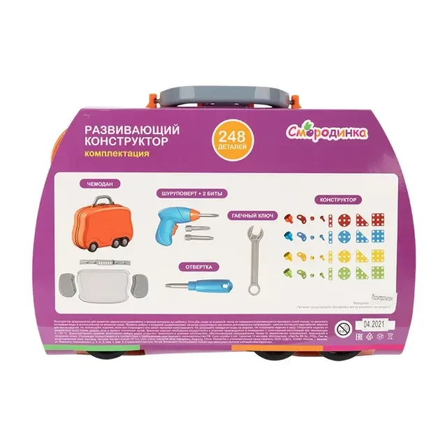 Развивающий детский конструктор Смородинка надолго увлечет малыша, а тем временем, мама сможет заняться своими делами или отдохнуть. Конструктор понравится как мальчикам, так и девочкам благодаря множеству ярких деталей и возможности воплотить свою уникальную идею на плоскости или в качестве 3D модели. Набор развивает мелкую моторику рук и творческое мышление. В состав набора входят: конструктор, чемодан на колесиках для удобного перемещения и компактного хранения деталей (приучает соблюдать порядок), разноцветная мозаика, отвертка, шуруповерт с реверсом (для удобного закручивания и раскручивания шурупов), гаечный ключ, инструкция. Инструменты работают от батареек типа АА (батарейки в комплект не входят). В комплекте 248 деталей, которые выполнены из высококачественного гипоаллергенного ABS-пластика. Размер: 29х9х20,5 см.