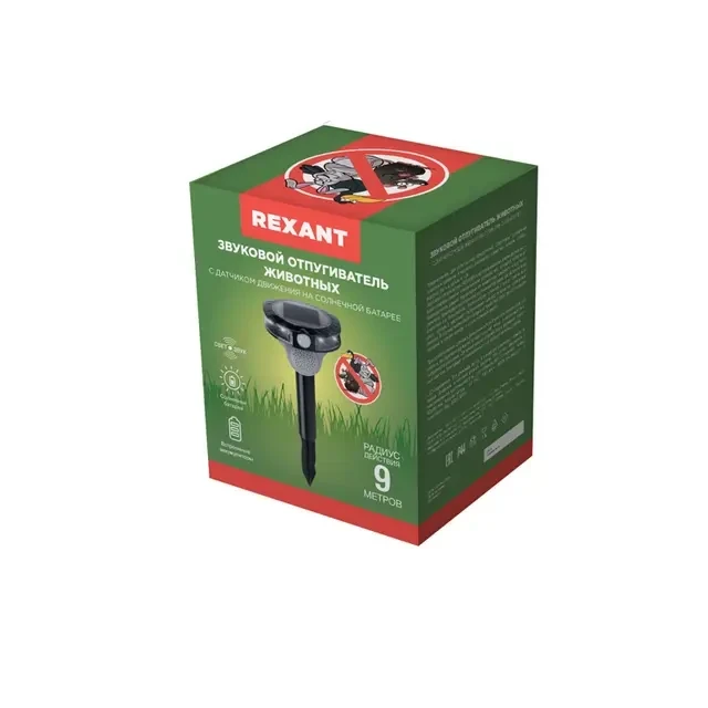 Звуковой отпугиватель животных с датчиком движения REXANT – это современное устройство, которое позволяет обезопасить вас и вашу территорию от непрошеных гостей (животных среднего и крупного размера). При срабатывании датчика движения отпугиватель имитирует лай собаки, выстрел из ружья или клич хищной птицы (в зависимости от выбранного режима). Устройство отпугивает животных светом благодаря установленным на корпусе ярким диодам. Источником питания служит солнечный свет, который заряжает встроенные аккумуляторы от солнечной панели. В случае пасмурной погоды устройство работает от аккумуляторов, в ясную погоду – от солнечной панели.