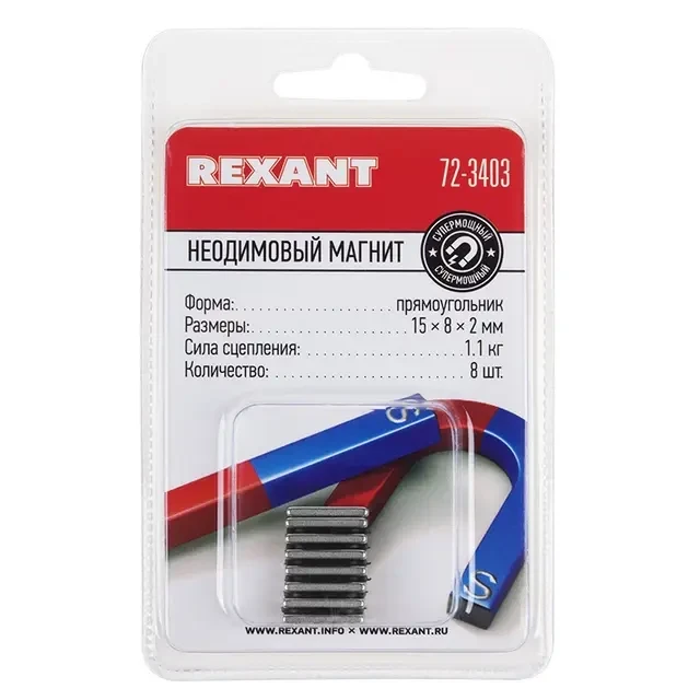 Неодимовый магнит прямоугольник 15х8х2мм, сцепление 1,1кг (8 шт/уп) REXANT