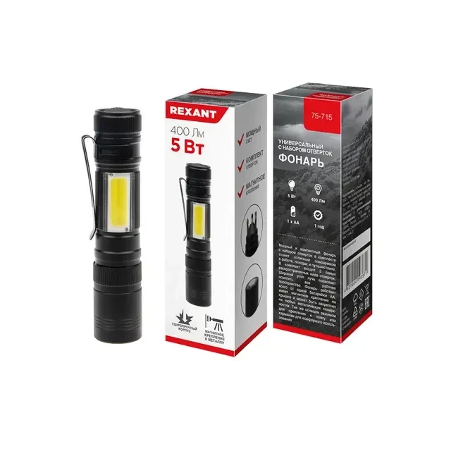Фонарь универсальный, трехрежимный, в алюминиевом корпусе, с набором отверток REXANT