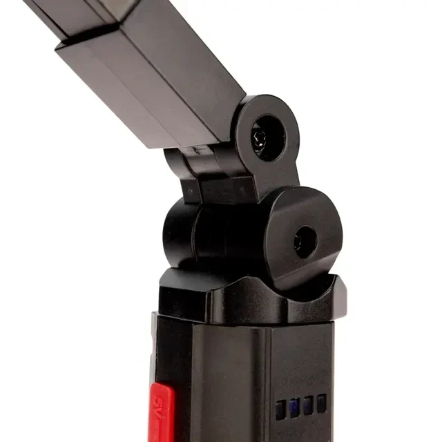 Автомобильный аккумуляторный светодиодный фонарь используется в гаражах и мастерских. Особенно полезен при необходимости ремонта в пути. Устройство оснащено удобной петлей для подвеса, а также магнитом, который предполагает возможность размещения на любой металлической поверхности. Благодаря шарниру корпус можно поворачивать вокруг оси на 360 градусов, что позволяет с удобством менять направление света, без необходимости перестановки изделия. Дальность луча составляет 30 м, что обеспечивает хорошую видимость, даже если фонарь находится на некотором расстоянии от рабочего места. Предусмотрен регулятор для изменения уровня яркости в зависимости от потребностей. Зарядка устройства осуществляется через прикуриватель авто от USB-кабеля длиной 100 см, который поставляется в комплект. Встроенный индикатор предупреждает о необходимости своевременной подзарядки фонаря. Размер изделия в сложенном виде – 36х36х 212 мм, в разложенном виде – 36х36х395 мм. Внимание! Не включайте фонарь во время зарядки.