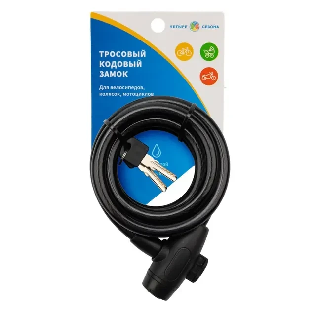Тросовый замок с ключом ЧЕТЫРЕ СЕЗОНА – недорогое и надежное средство от кражи велосипедов, мопедов, колясок, рекламных щитов, вывесок и другого имущества. Изготовлен из прочного стального троса, покрытого износостойкой ПВХ-оплеткой. Отличается простой конструкцией, удобством использования и стойкостью к взлому. Гибкий трос обеспечивает удобство фиксации даже в сложных условиях, а его длина подходит для надежного крепления к различным предметам. В комплекте компактный ключ, который с легкостью помещается в кармане или в кошельке.