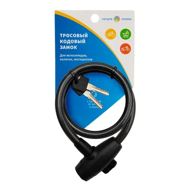 Тросовый замок с ключом ЧЕТЫРЕ СЕЗОНА – недорогое и надежное средство от кражи велосипедов, мопедов, колясок, рекламных щитов, вывесок и другого имущества. Изготовлен из прочного стального троса, покрытого износостойкой ПВХ-оплеткой. Отличается простой конструкцией, удобством использования и стойкостью к взлому. Гибкий трос обеспечивает удобство фиксации даже в сложных условиях, а его длина подходит для надежного крепления к различным предметам. В комплекте компактный ключ, который с легкостью помещается в кармане или в кошельке.