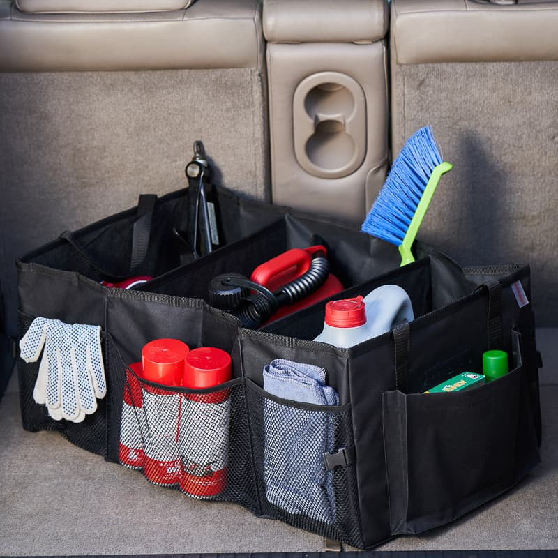 Универсальный органайзер размером 60х39х26 см – это удобное и практичное решение для организации и хранения вещей в багажном отделении автомобиля. Органайзер оснащен тремя отделениями, которые позволяют хранить различные предметы, инструменты, средства для ухода за автомобилем, автохимию, аптечку, перчатки и многое другое. Вместимость органайзера составляет 65 литров, что обеспечивает достаточно места для размещения необходимых вещей. На внешней части изделия расположено 9 карманов для хранения нужных мелочей. На дне органайзера предусмотрены липучки, предназначенные для предотвращения скольжения по багажнику. Пластиковые зажимы предусмотрены для удобного хранения органайзера в сложенном виде.