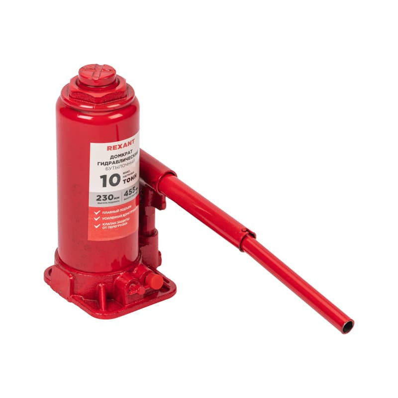Гидравлический бутылочный домкрат REXANT предназначен для поднятия грузов массой до 10 тонн на высоту до 455 мм. Оптимален для автомобилей с большим клиренсом. Оснащен гидравлической системой, обеспечивающей высокую мощность и надежность. Домкрат станет незаменимым помощником как для автолюбителей, так и для профессионалов на СТО. Отличается плавностью хода, надежностью и жесткостью конструкции. Клапан безопасности предотвращает подъем груза тяжелее 10 т, предохраняя домкрат от поломки. Максимальная нагрузка – 10 т. Высота подхвата – 230 мм. Высота подъема – 455 мм. Материал корпуса – сталь, чугун.