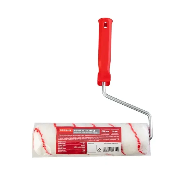 Малярный валик серии «Мастер» REXANT имеет меховое покрытие и применяется при производстве малярных работ в строительстве, предназначен для окраски поверхностей лакокрасочным составом. Валик состоит из пластмассового цилиндра, мягкой шубки, бугеля (изогнутого металлического стержня) и удобной пластиковой рукоятки. ОСНОВНЫЕ ПРЕИМУЩЕСТВА: 1) Шубка валика – универсальная ткань, которая подходит для всех видов ЛКМ, особенно хорошо подходит для акриловых эмалей. 2) Данный вид ворса идеален для обработки шероховатых поверхностей. 3) Усиленная ручка изделия обеспечивает долгий срок службы валика. 4) Валик изготовлен по технологии Thermofusion (заводское нанесение ткани на расплавленное основание). ТЕХНИЧЕСКИЕ ХАРАКТЕРИСТИКИ: Материал ролика: пластмасса Ширина ролика: 240 мм Диаметр ролика: 42 мм Материал шубки: полиамид Цвет шубки: белый с желтой полосой Длина ворса: 11 мм Материал бюгеля: металл Ширина бюгеля: 8 мм Материал рукоятки: пластик Малярный инструмент REXANT сделает работу по строительству и ремонту быстрой и качественной. Вы с легкостью справитесь с поставленной задачей, а результат будет радовать вас долгие годы!