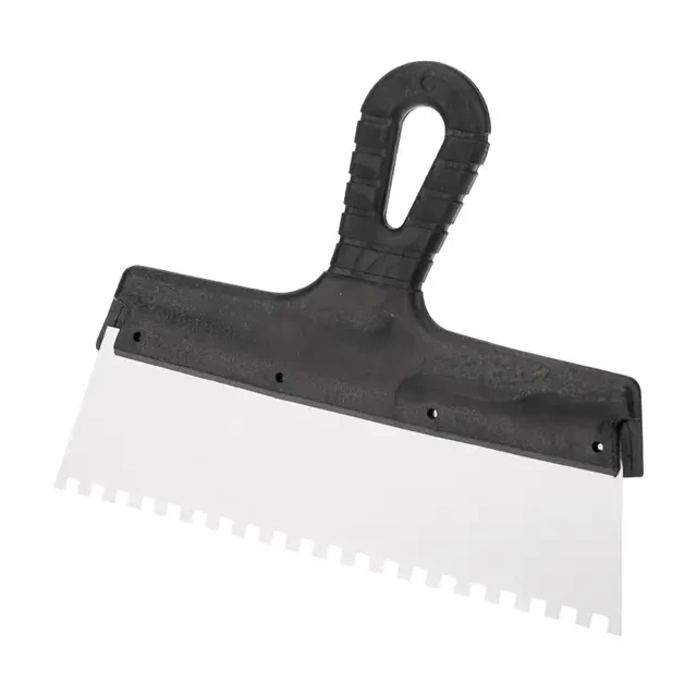 Фасадный шпатель REXANT предназначен для отделки поверхностей внутри и снаружи помещений. Используется для нанесения и выравнивания по поверхностям штукатурки, шпатлевки и других строительных растворов, заделки трещин и швов. В зависимости от предстоящих работ и их объемов, вы легко подберете инструмент с подходящими параметрами. Фасадный шпатель оснащен эргономичной пластмассовой ручкой с рифлением, которая обеспечивает надежный хват инструмента при использовании, в том числе, в грубых строительных перчатках. Основной рабочей частью инструмента является стальное полотно, поэтому для производства шпателей REXANT используется нержавеющая высоконагартованная сталь (1500 н/мм) марки AISI 201 толщиной 0,42 мм. Сталь данной марки обладает улучшенными механическими свойствами, исключающими деформацию полотна в процессе работы. Технические характеристики: Материал рукоятки: пластик Материал рабочего полотна: нержавеющая сталь Ширина рабочего полотна: 250 мм Высота рабочего полотна: 58 мм Толщина рабочего полотна: 0,42 мм Размер зубчика (ШхВ): 6х6 мм Марка стали: высоконагартованная (1500 н/мм) Отверстие для подвеса: есть