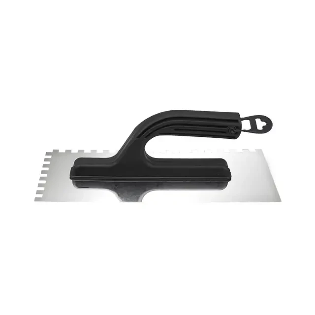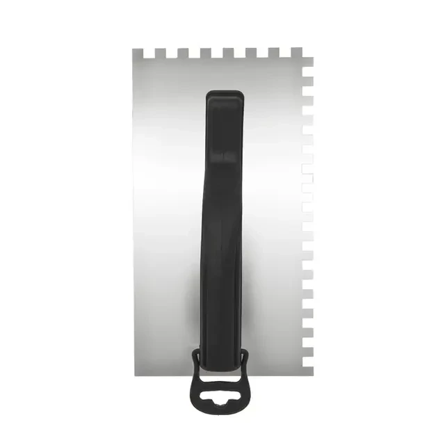 Гладилка прямая (зубчатая) изготовлена из нержавеющей стали, оснащена эргономичной пластиковой ручкой. Используется для качественного нанесения различных сухих смесей, их распределения по поверхности, а также сглаживания неровностей и швов. В ремонтных, а также отделочных работах гладилка малярная и штукатурная используется повсеместно. Она незаменима в случаях, когда необходимо нанести много раствора тонким слоем. Применяется для шпаклевки, обычной и декоративной штукатурки, клея и различных строительных смесей. Материал рукоятки: пластик Материал рабочего полотна: нержавеющая сталь марки AISI 430 Ширина рабочего полотна: 130х270 мм Размер зубчика (ШхВ): 10х10 мм