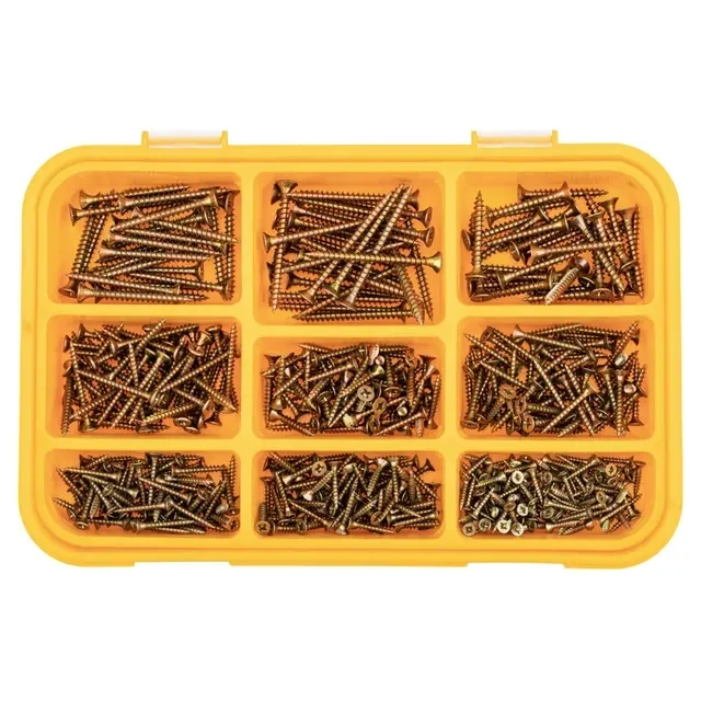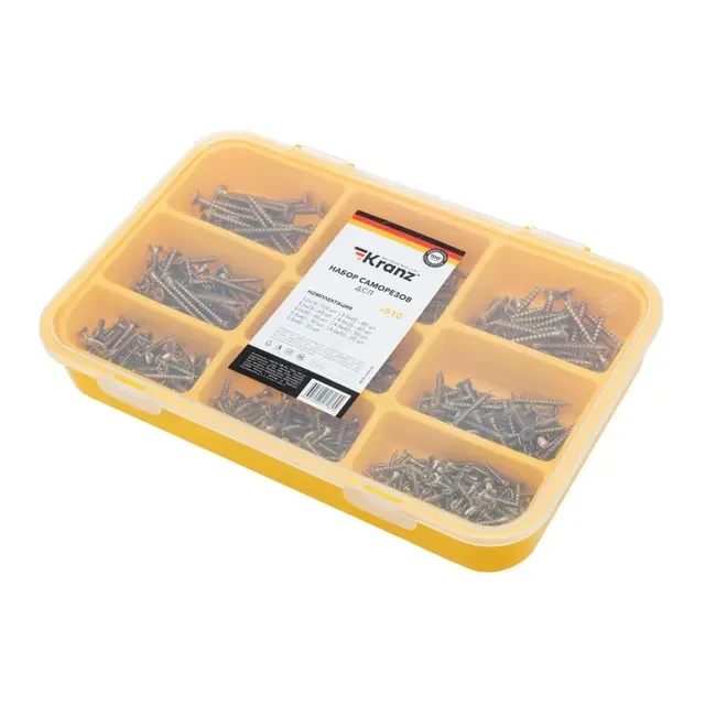 Набор саморезов используется для крепления тонколистового металла, древесно-стружечных и гипсокартонных плит, брусьев, досок, полимерных ламелей к деревянным основаниям без предварительного сверления. В комплексе с пластиковым дюбелем универсальные саморезы DIN 7962 могут использоваться для крепления к бетону, кирпичу, шлакоблоку. Саморезы изготовлены из стали, покрытой желтым цинком, что обеспечивает изделиям высокую прочность и долговечность. Большой набор состоит из 510 саморезов для ДСП и подойдет для объемных и длительных проектов. Поставляется в пластиковом органайзере, который помогает не только удобно хранить изделия, но и быстро находить крепеж нужного размера. Органайзер может в дальнейшем использоваться для хранения других крепежных элементов. Набор состоит из саморезов 3,0x16 (120 шт.); 3,5x20 (80 шт.); 3,5x25 (60 шт.); 4,0x25 (60 шт.); 4,0x30 (60 шт.); 4,0x40 (50 шт.); 5,0x40 (30 шт.); 5,0x50 (25 шт.); 5,0x60 (25 шт.).