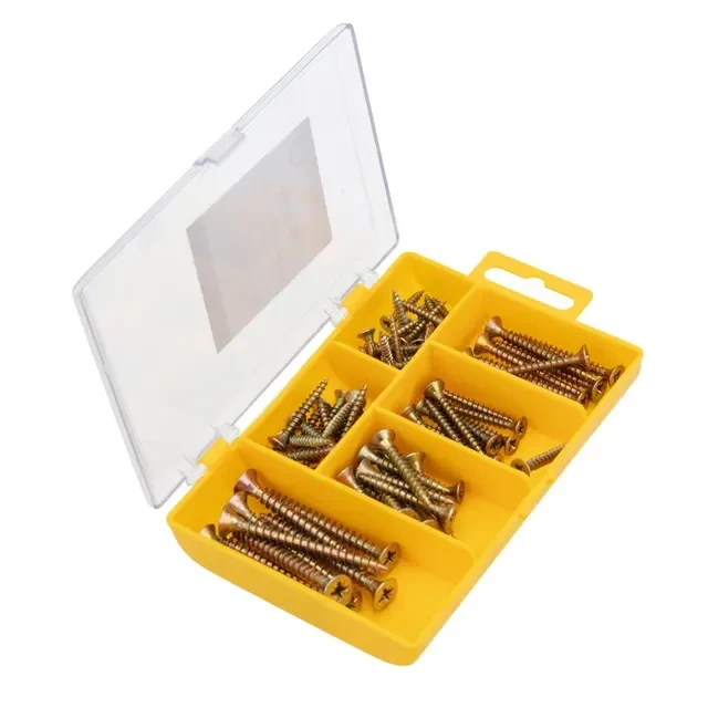 Набор саморезов используется для крепления тонколистового металла, древесно-стружечных и гипсокартонных плит, брусьев, досок, полимерных ламелей к деревянным основаниям без предварительного сверления. В комплексе с пластиковым дюбелем универсальные саморезы DIN 7962 могут использоваться для крепления к бетону, кирпичу, шлакоблоку. Саморезы изготовлены из стали, покрытой желтым цинком, что обеспечивает изделиям высокую прочность и долговечность. Небольшой набор состоит из 76 саморезов для ДСП, которых хватит для выполнения базовых задач. Поставляется в пластиковом органайзере, который помогает не только удобно хранить изделия, но и быстро находить крепеж нужного размера. Органайзер может в дальнейшем использоваться для хранения других крепежных элементов. Набор состоит из саморезов 3,0×20 (20 шт.), 3,5×25 (16 шт.), 3,5×30 (14 шт.), 4,0×30 (10 шт.), 4,0×40 (8 шт.), 5,0×50 (8 шт.).