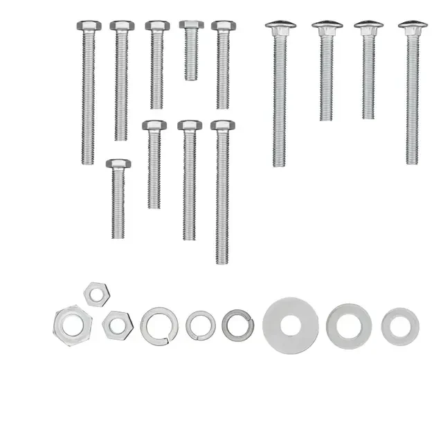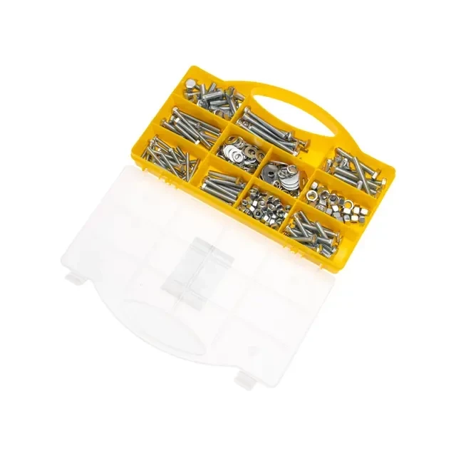 Набор болтов, гаек и шайб предназначен для соединения деталей при сборке мебели, монтаже и установке бытовой техники, закреплении различных строительных конструкций. Готовый набор сэкономит время, которое могло бы уйти на подбор элементов крепежа подходящего размера. Крепежные изделия изготовлены из высококачественного материала, который обеспечивает высокую прочность и долговечность. Набор состоит из 450 крепежных элементов, которых хватит на выполнение большого количества задач. Поставляется в пластиковом органайзере, который помогает не только удобно хранить изделия, но и быстро находить крепеж нужного размера. Органайзер может в дальнейшем использоваться для хранения других крепежных элементов. Состав набора: – болты шестигранные DIN 933 5x30 (10 шт.); 5x40 (10 шт.); 6x20 (10 шт.); 6x30 (10 шт.); 6x40 (10 шт.); 6x60 (5 шт.); 8x20 (10 шт.); 8x30 (10 шт.); 8x50 (5 шт.); –болты мебельные DIN 603 6x40 (5 шт.); 6x50 (10 шт.); 6x60 (10 шт.); 6x80 (5 шт.); – гайки шестигранные DIN 933 M5 (20 шт.); M6 (65 шт.); M8 (25 шт.); – шайбы DIN 127 M5 (20 шт.); M6 (65 шт.); M8 (25 шт.); – шайбы DIN 125 M5 (20 шт.); M6 (65 шт.); M8 (25 шт.); M8 (10 шт.).