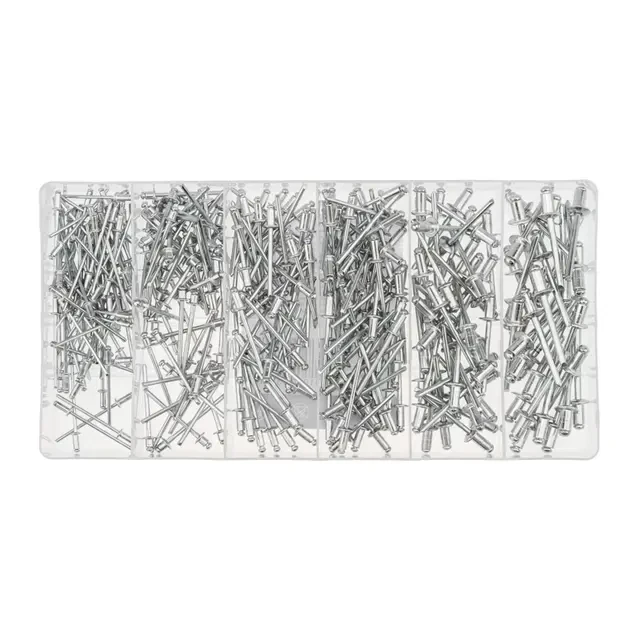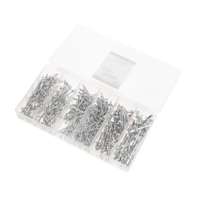 Набор вытяжных заклепок предназначен для использования совместно с заклепочником для соединения тонких деталей и сборки различных конструкций, доступ к которым возможен только с одной стороны. Заклепки подходят для скрепления предметов из металла, древесины, пластмассы, кожи, обеспечивают эстетичное соединение. Штифт заклепки изготовлен из высококачественного алюминия, а втулка – из стали, благодаря прочным материалам заклепки обладают высокой прочностью и долговечностью. Набор состоит из 320 крепежных элементов, которых хватит для выполнения множества задач. Поставляется в пластиковом органайзере, который помогает не только удобно хранить изделия, но и быстро находить крепеж нужного размера. Органайзер может в дальнейшем использоваться для хранения других крепежных элементов. Набор состоит из заклепок 2,4x5,5 мм (80 шт.); 3,2x3,2 мм (60 шт.); 3,2x6 мм (50 шт.); 3,2x7,5 мм (60 шт.); 4,0x8 мм (40 шт.); 4,8x8 мм (30 шт.).