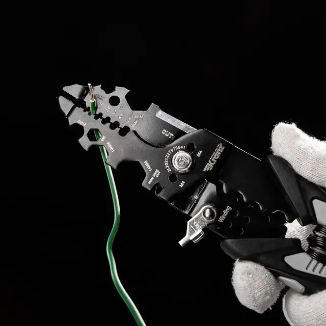 Многофункциональные плоскогубцы 15 в 1 предназначены для выполнения различных электромонтажных работ. Плоскогубцы изготовлены из хромованадиевой стали высокой твердости и обладают защитным антикоррозийным покрытием. Рукоятки эргономичной формы снижают усталость при длительном использовании. Прорезиненное покрытие гарантирует надежный захват и предотвращает скольжение. Пружина между ручками упрощает работу с инструментом и делает использование более эффективным и удобным. Для удобства хранения предусмотрен специальный фиксатор закрытого положения. Функции: 1. Зажим 2. Тонкогубцы 3. Стриппер для снятия изоляции провода сечением от 1,6 до 5,8 мм² 4. Кабелерез 5. Резак для зачистки изоляции 6. Инструмент для обжима клемм 7. Скрутка жил 8. Обрезка проволоки и гвоздей 9. Ключи 5, 6, 7, 8, 10, 13, 14 мм