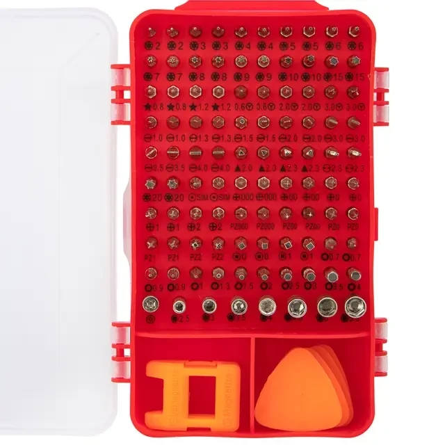 Набор отверток для точных работ KRANZ отлично подходит для ремонта телефонов, компьютеров, приемников и для многих популярных приборов, которые используются в быту. Выполнен из высококачественной хромованадиевой стали CR-V с высокой устойчивостью к коррозии и образованию ржавчины. Точно подобранные по характеристикам магнитные насадки отлично подходят для профессионального ремонта и для мелких бытовых работ. В наборе 114 предметов: Биты: PH000х2, PH00х2, PH0х2, PH1х2, PH2х2 Special PH2 SL1х2, SL1.3х2, SL1.5х2, SL2х2, SL3х2, SL3.5х2, SL4x2 T2х2, T3х2, T4х2, T5х2, T6x2, T7x2, T8x2, T9x2, T10x2, T15x2, T20x2 H0.7x2, H0.9x2, H1, H1.3, H1.5, H2, H2.5, H3, H3.5, H4 P2х2, P5х2, / Pentalobe 0.8х2, 1.2х2, Triangle 2x2, 2.3x2 SQ0,1x2 U2.3х2 ° 0.8x2 Y0.6х2, Y2х2, Y3x2 PZ000x2, PZ00x2, PZ0x2, PZ1x2, PZ2x2 M2.5, M3, M3.5, M4, M4.5, M5, M5.5 Рукоятка, удлинитель, гибкий удлинитель, пинцет, переходник, магнит, присоска, игла Спуджеры и медиаторы: 10 шт. Посадка бит: 1/8