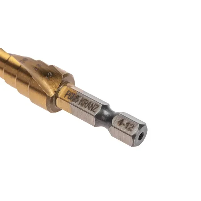 Ступенчатое сверло KRANZ предназначено для сверления отверстий различных диаметров одним сверлом в материалах толщиной до 5 мм (сталь, цветные металлы, нержавейка, пластик, дерево). На каждую ступень сверла нанесена маркировка фактического диаметра. Изделие оснащено шестигранным хвостовиком, что предотвращает проворачивание в зажимных патронах. Сверло изготовлено из высококачественной быстрорежущей стали Р6М5, которая обеспечивает надежность, стабильное качество работы, долгий ресурс и высокую производительность. Сверление металла становится более легким благодаря спиральной форме профиля. Покрытие из нитрид-титана предотвращает преждевременный износ инструмента и образование коррозии. Обладает высокой прочностью и повышенной точностью в отличие от обычных сверл данного типа.