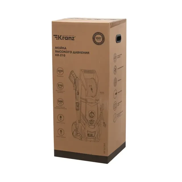 Мойка высокого давления KR-210 эффективно устраняет различные виды загрязнений при помощи струи воды под высоким давлением. Предназначена для бытового использования. Мощный двигатель 2600 Вт обеспечивает давление до 210 бар и производительность до 500 л/ч. Алюминиевая помпа гарантирует надежность и стабильное давление. Опция блокировки рычага пистолета исключает случайную подачу воды. При перегреве мотор отключается автоматически, что предотвращает его поломку. Фильтр тонкой очистки защищает компоненты мойки и очищаемую поверхность от повреждения мельчайшими твердыми частицами. Функция самостоятельного забора воды из емкости позволяет использовать мойку в местах без водопровода. Регулируемое сопло и сменные быстросъемные насадки с разными углами распыления (0, 15, 25, 40) позволяют изменять интенсивность струи, а также наносить моющие средства. Пеногенератор встроен в корпус мойки. Подача пены плавно регулируется поворотной рукояткой. Система полной остановки выключает двигатель при отпускании клавиши пистолета, что экономит энергию и увеличивает ресурс. Мойка отличается мобильностью благодаря кабелю длиной 5 м, удобной рукоятке и колесам. Усиленный армированный шланг длиной 8 м обеспечивает удобство использования. На корпусе мойки располагается держатель пистолета и распылителя, а также встроенный крюк для крепления провода. Предусмотрены быстросъемные коннекторы фиксации шланга и насадок.