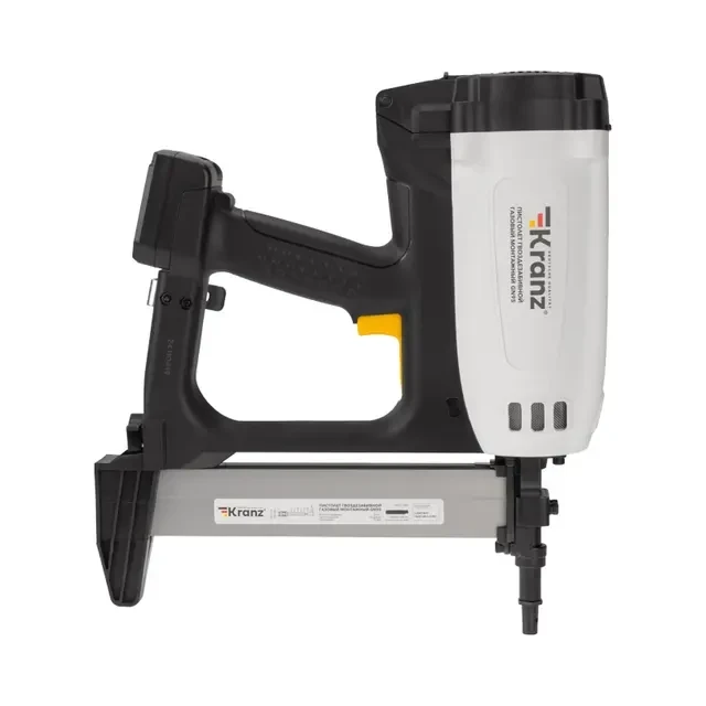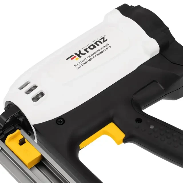 Гвоздезабивной газовый пистолет предназначен для быстрого монтажа крепежных изделий к бетонным поверхностям, кирпичной кладе и изделиям из металлопроката. Инструмент обладает силой удара в 95 Дж, что позволяет забивать гвозди длиной от 15 до 40 мм и диаметром от 2,7 до 3,05 мм. Емкость магазина – 30 гвоздей. Одного газового баллона хватает на 1100 гвоздей. Длина баллона без учета пластикового клапана 165 мм. При производстве применяются современные технологии закалки. Твердость сопел равна 52 HRC, что уменьшает износ и способствует стабильной, надежной и продолжительной работе инструмента. Твердость бойка – 57 HRC. Для увеличения ресурса инструмента в электродвигателе используют высококачественные японские компоненты. Цилиндры (камера сгорания) произведены из литого алюминия. Обработка поверхности цилиндров осуществляется на станках с ЧПУ, что способствует более высокой точности обработки всех деталей и сокращению брака. В комплекте поставляются 3 быстросъемные насадки для работы с различным крепежом.