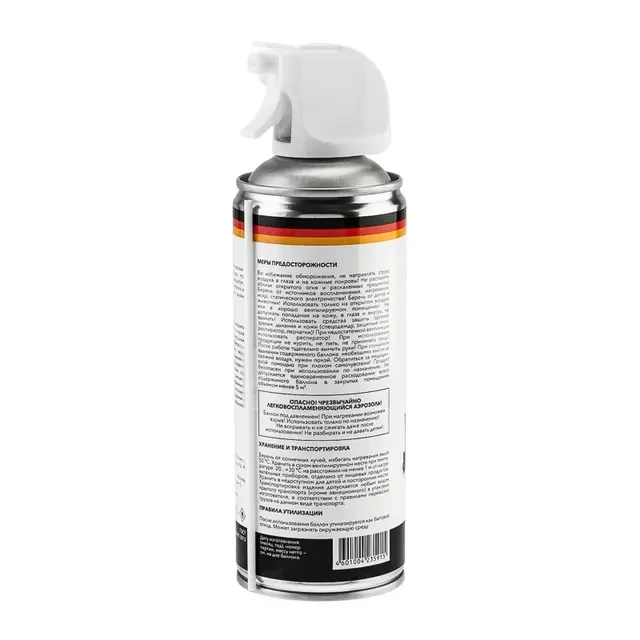 DUST OFF – удаляет пыль и другие загрязнения направленным потоком сжатого воздуха, разработан и рекомендуется для эффективной бесконтактной чистки чувствительного электронного оборудования и компонентов, устройств обработки данных, персональных компьютеров, оптических приборов, фотографических материалов, микроскопов и лабораторного оборудования. Используется везде, где необходимо удалить загрязнение не оставляя следов, при этом исключая опасность испортить покрытие. С помощью прилагаемой в комплекте трубки ненужные частицы сдуваются направленной струей газа. Хорошая альтернатива очищающим средствам на основе растворителей. Рекомендации: Распыляя, держите баллон вертикально! После многоразового или продолжительного применения, дайте продукту некоторое время для восстановления внутреннего давления. Не трясите и не передвигайте баллон во время использования. Рекомендуется соблюдать обычные меры предосторожности для аэрозольных баллонов. Во избежание обморожения частей тела, не рекомендуется направлять струю сжатого газа на кожные покровы. Состав газа в баллоне существенно отличается от обычного воздуха, поэтому не рекомендуется вдыхать концентрированные пары аэрозоля. Рабочие температуры: -40...+400 °C Диэлектрическая проницаемость: 1,0-1,6 ε Объем баллона: 520 мл Объем содержимого: 400 мл Срок годности: 36 месяцев