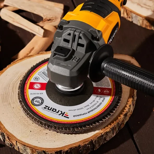 Лепестковый торцевой круг применяется совместно с ручными угловыми шлифовальными машинами (болгарками) соответствующего диаметра. Шлифовальные диски предназначены для предварительной, промежуточной и финишной обработки металла, дерева, пластика и других материалов. Конструктивная особенность кругов – веерное расположение лепестков абразивного материала, что обеспечивает плавную работу круга и отсутствие перегрева в зоне шлифования. Лепестковый круг изготовлен из шлифовальной шкурки на тканевой основе. Благодаря торцевому типу диска (T-29) увеличивается пятно контакта, что повышает скорость обработки поверхности и уменьшает возможность возникновения дефектов в виде зарезов, ям и прижогов. Тканевая основа лепестков равномерно изнашивается в процессе работы и открывает следующий слой абразива, позволяя полностью использовать ресурс круга. Наружный диаметр – 150 мм, посадочный – 22,2 мм. Max 12200 RPM.