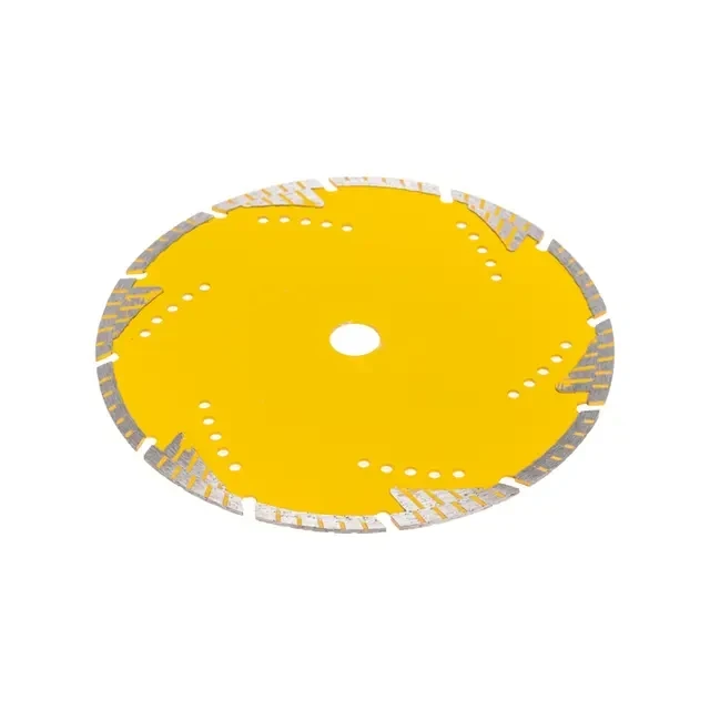 Диск алмазный отрезной Turbo KRANZ предназначен для сухой резки строительных материалов, таких как природный и искусственный камень, армированный бетон, кирпич, керамика. Используется в угловой шлифовальной машине, ручном электрическом плиткорезе, штроборезе. Диск оснащен защитными секторами, которые обеспечивают защиту режущего слоя от бокового износа, что значительно продлевает срок службы. Уникальная форма алмазных сегментов позволяет использовать диск без охлаждения, обеспечивает быстрый и аккуратный рез, позволяет выполнять кратковременную обработку боковой поверхностью без риска поломки. Диск выполнен из инструментальной стали и синтетического алмаза. Изготовлен методом горячего прессования, что значительно улучшает качество металлической связки и обеспечивает высокую концентрацию алмазов. Процесс резки сопровождается воздушным охлаждением. Срок годности не ограничен. Хранить в сухом прохладном месте. Использовать строго по назначению. Внимание! Запрещается использовать диск для разрезания металлов. При установке диска руководствуйтесь стрелкой направления вращения диска. Используйте средства индивидуальной защиты. Не утилизируйте с бытовыми отходами.