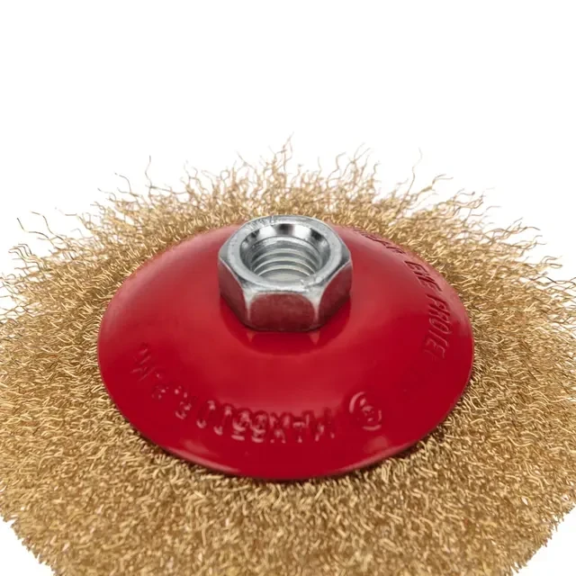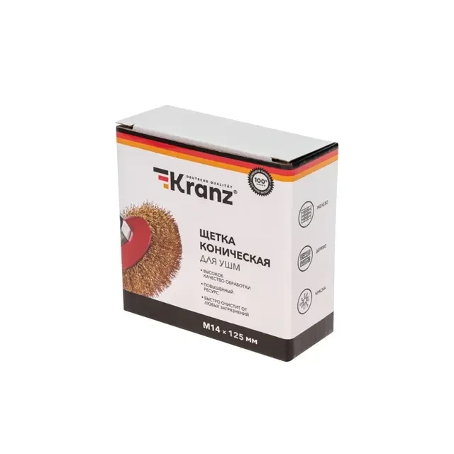 Коническая щетка KRANZ применяется в составе с угловой шлифовальной машиной с целью очистки разнообразных металлических деталей и заготовок от слоя краски, лака, заусенцев, ржавчины, окалины или нагара. Подходит для обработки и выравнивания сварочных швов на стальных поверхностях. Витая щетина из латунированной проволоки оптимально подходит для аккуратной обработки и шлифовки, позволяет удалить тонкий слой материала, а также придать поверхности глянцевый блеск. Латунированная проволока имеет высокую устойчивость к коррозии, а при работе возникает меньше искр. Коническая форма щетки позволяет легко достигать труднодоступных участков и обрабатывать поверхности различных форм и размеров. Тип соединения М14 обеспечивает простоту и надежность установки на УШМ. Инструмент соответствует действующим стандартам качества и подходит для использования в условиях интенсивного и сложного труда.