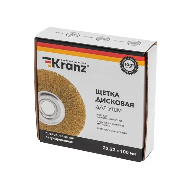 Дисковая щетка KRANZ применяется в составе угловой шлифовальной машины с целью очистки разнообразных деталей и заготовок от слоя краски, лака, заусенцев, ржавчины, окалины или нагара. Подходит для обработки и выравнивания сварочных швов на стальных поверхностях. Витая щетина из латунированной проволоки оптимально подходит для аккуратной обработки и шлифовки, позволяет удалить тонкий слой материала, а также придать поверхности глянцевый блеск. Латунированная проволока имеет высокую устойчивость к коррозии, а при работе возникает меньше искр. Дисковая форма позволяет легко достигать труднодоступных участков. Инструмент подходит для выполнения работ, требующих значительных силовых нагрузок и продолжительного воздействия на загрязненную поверхность. Щетка соответствует стандартам качества и обеспечивает безопасную работу в указанном диапазоне оборотов. Тип соединения – отв. 22,23 мм