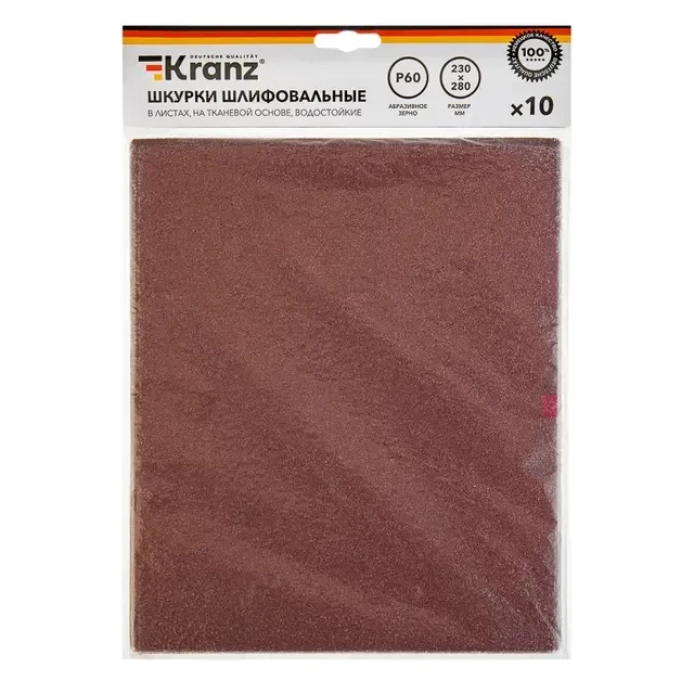 Шкурки шлифовальные в листах на тканевой основе, водостойкие 230х280мм, Р60 (10 шт/уп) KRANZ