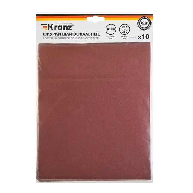 Шкурки шлифовальные в листах на тканевой основе, водостойкие 230х280мм, Р180 (10 шт/уп) KRANZ
