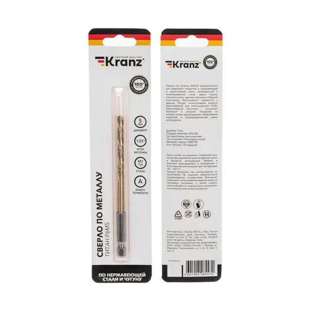Сверло по металлу, 5мм, Р6М5, ТИТАН, шестигранный хвостовик (1 шт. в упаковке) DIN 338 KRANZ