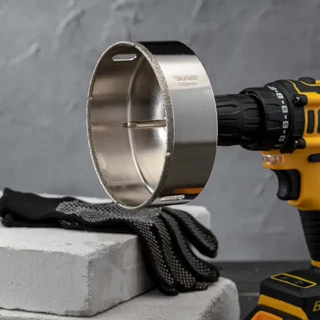 Алмазная коронка диаметром 120 мм используется при сверлении керамогранита, керамики, стекла. Наличие центровочного сверла обеспечивает точное позиционирование коронки на поверхности и помогает избежать смещения во время работ. Покрытие алмазной коронки выполнено гальваническим способом в два слоя, что обеспечивает эффективное сверление и продолжительный рабочий ресурс инструмента. Равномерное распределение алмазов по режущей кромке гарантирует аккуратное сверление материала без трещин и сколов. Высота алмазного слоя в 6 мм обеспечивает высокую производительность, а трехгранный хвостовик – надежную фиксации в патроне. При использовании алмазных коронок для сверления отверстий необходимо охлаждение, которое достигается путем подачи воды в рабочую зону.