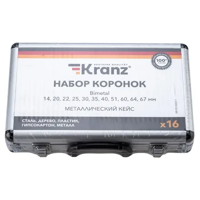 Набор биметаллических коронок KRANZ используется во время строительных и ремонтных работ. Подходит для сверления в безударном режиме дерева, стали, металла, гипсокартона и пластика совместно с дрелями, перфораторами и стационарными станками. Коронки, входящие в состав набора, выполнены из инструментальной стали, а зубья с переменным шагом 4-6 мм изготовлены из быстрорежущей стали Р6М5К8 с добавлением 8% кобальта, что обеспечивает стойкость к перегреву. В боковой стенке коронок предусмотрено отверстие, которое компенсирует деформации при перегреве, отводит строительную пыль и шлам. Особая заточка зубьев способствует эффективному входу в материал, что позволяет вырезать отверстия правильной круглой формы без сколов и трещин. Сверление металла/стали необходимо осуществлять с применением смазочно-охлаждающей жидкости. Набор поставляется в металлическим кейсе. В комплектацию входят 16 предметов: 6 коронок диаметром 14, 20, 22, 25, 30, 35, 40, 51, 60, 64, 67 мм , 2 хвостовика для коронок, 2 шестигранных ключа, 1 адаптер.