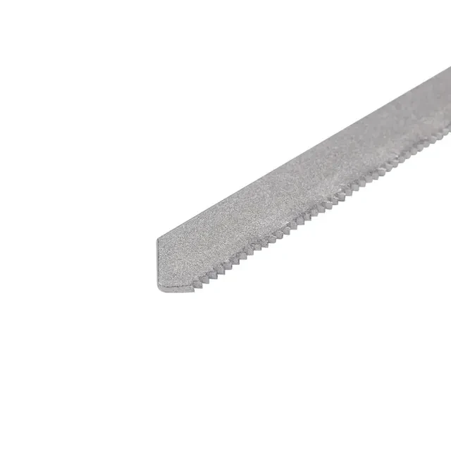 Полотно для электролобзика предназначено для распила тонких листов металла толщиной от 0,9 до 1,2 мм. Подходит как для бытового, так и для профессионального применения, используется при выполнении слесарных работ, также будет полезно в быту. Полотно пилки выполнено из быстрорежущей закаленной стали, благодаря чему оно надолго сохраняет устойчивость к динамическим нагрузкам, а также режущую способность. Режущая кромка состоит из зубьев с шагом 1,016 мм и предназначена для чистого реза, волновая разводка облегчает распиловку. Улучшенная закалка токами высокой частоты увеличивает твердость зубьев и обеспечивает высокий ресурс. Универсальный Т-образный хвостовик подходит для установки на большинство моделей электролобзиков. Комплект состоит из двух полотен и рассчитан на выполнение большого объема работ.