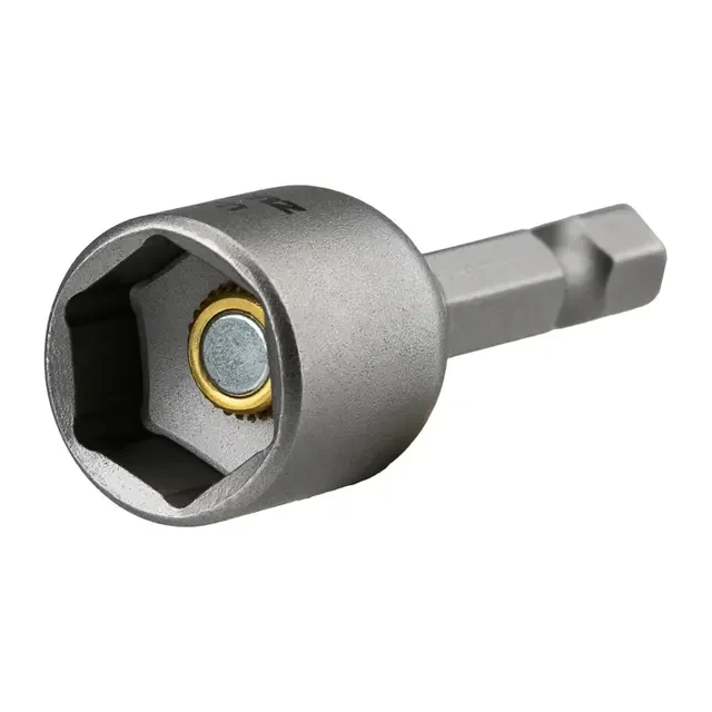 Ключ-насадка предназначен для работы с кровельными саморезами, гайками и винтами с внешним шестигранником. Используется с шуруповертом, дрелью или с отверткой-адаптером. Изготовлен из высококачественной стали CrV, благодаря чему устойчив к статическим и динамическим нагрузкам и износу. Внутрь головки ключа впрессован магнит, который надежно удерживает крепеж. Шестигранный хвостовик обеспечивает надежное закрепление ключа в патроне инструмента и не дает проворачиваться ключу. Благодаря хвостовику подойдет для установки на все виды шуруповертов и отверток-адаптеров.
