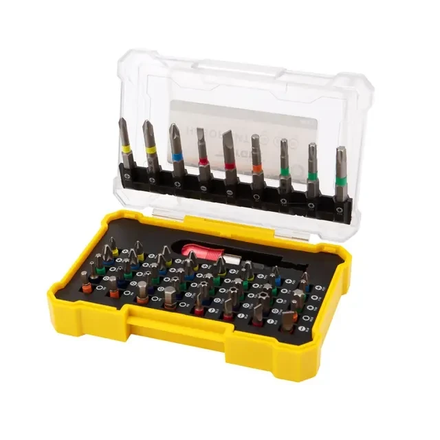 Набор односторонних бит с магнитным держателем используется для работы с крепежом популярных типов и размеров с помощью шуруповерта или отвертки-адаптера. Будет полезен как для профессионального использования, так и в быту. Биты изготовлены из легированной высокопрочной стали S2, что дает повышенную устойчивость к изломам и деформации в наиболее нагружаемых точках касания. Подходят для работы со шлицами типа PH, PZ, Torx, SL, HEX популярных диаметров. Намагниченные наконечники облегчают крепление и фиксацию крепежа на бите. В набор также входит магнитный держатель для бит, который позволяет легко менять биты и крепко удерживает их в посадочном отверстии. Шестигранный хвостовик подходит для установки на все виды шуруповертов и отверток-адаптеров и не дает проворачиваться бите в патроне инструмента. Комплектация: биты типа PH (8 шт.), биты типа PZ (7 шт.), биты типа Torx (22 шт.), биты типа SL (6 шт.), биты типа HEX (6 шт.), магнитный держатель (1 шт.). Набор упакован в удобный для хранения кейс, где для каждой биты предусмотрена отдельная ячейка.