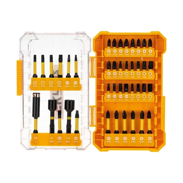 Набор бит для шуруповерта предназначен для закручивания различных видов крепежа: шурупов, винтов и т.д. Биты изготовлены из высококачественной японской стали S2 и подвергнуты закалке для достижения оптимальной твердости. Благодаря использованию торсионного профиля достигается продолжительный срок службы и устойчивость к ударным нагрузкам. Набор содержит магнитный держатель из нержавеющей стали длиной 75 мм для удобства работы с битами. Также предусмотрены торцевые головки (ключи-насадки) из стали 40Х для закручивания кровельных саморезов, болтов и гаек. Шестигранный хвостовик (Е6.3) гарантирует быструю и надежную фиксацию в шуруповертах, дрелях и т.д. Намагниченный наконечник бит обеспечивает удобство работы с крепежом. Биты имеют фосфатированное покрытие для лучшей защиты от коррозии и износа. Набор упакован в ударопрочный удобный пластиковый кейс и содержит широкий размерный ряд всех востребованных размеров бит. Биты 25 мм (24 шт): PH1, PH2х3 шт, PH3, PZ1, PZ2х3 шт, PZ3, SL3, SL4, SL5, SL6, H3, H4, H5, H6, T10, T15, T20, T25, T30, T40. Биты 50 мм (14 шт): PH2х3 шт, PZ2х3шт, SL3, SL4, SL5, SL6, T20, T25х2 шт, T30; Торцевые головки (ключи-насадки) 2 шт: 8х65 мм, 10х65 мм.